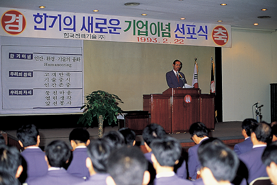 ‘21세기 초일류기업 도약’을 목표로 ‘K-SPEC·2000운동’을 선언하고, 기업이념의 재정립을 첫 과제로 삼았다. 전 직원의 의견 수렴과 전문가 자문을 거쳐 인간·환경·기술의 융화-Humaneering'이라는 새로운 기업이념을 공식 선포했다.