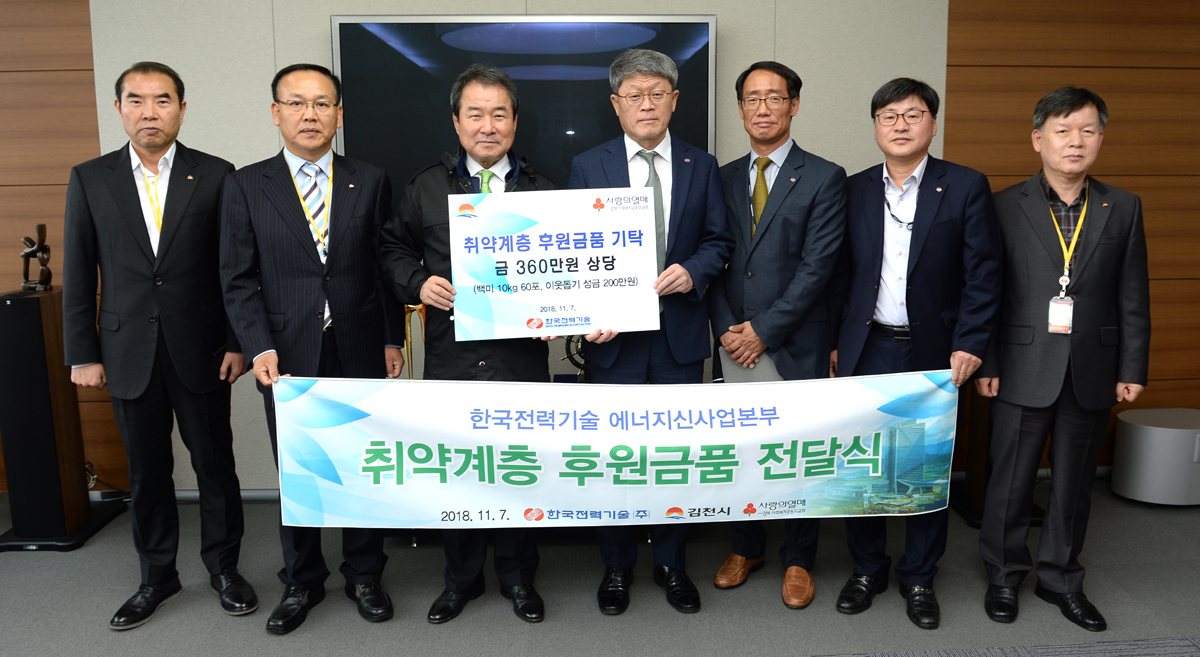 회사는 11월 7일 참사랑봉사단 활동의 일부로 김천시 취약계층을 위한 후원금품을 전달했다.본사 및 김천시청에서 열린 전달식에는 변화운 에너지신사업본부장과 김충섭 김천시장을 비롯한 관계자들이 참석했다.